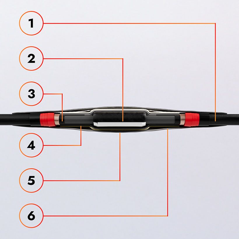 4) Chaussette en cuivre : Assure un contact optimal pour la continuité de l’écran du câble grâce à la pression permanente de la protection extérieure qui s’adapte parfaitement aux expansions du câble.